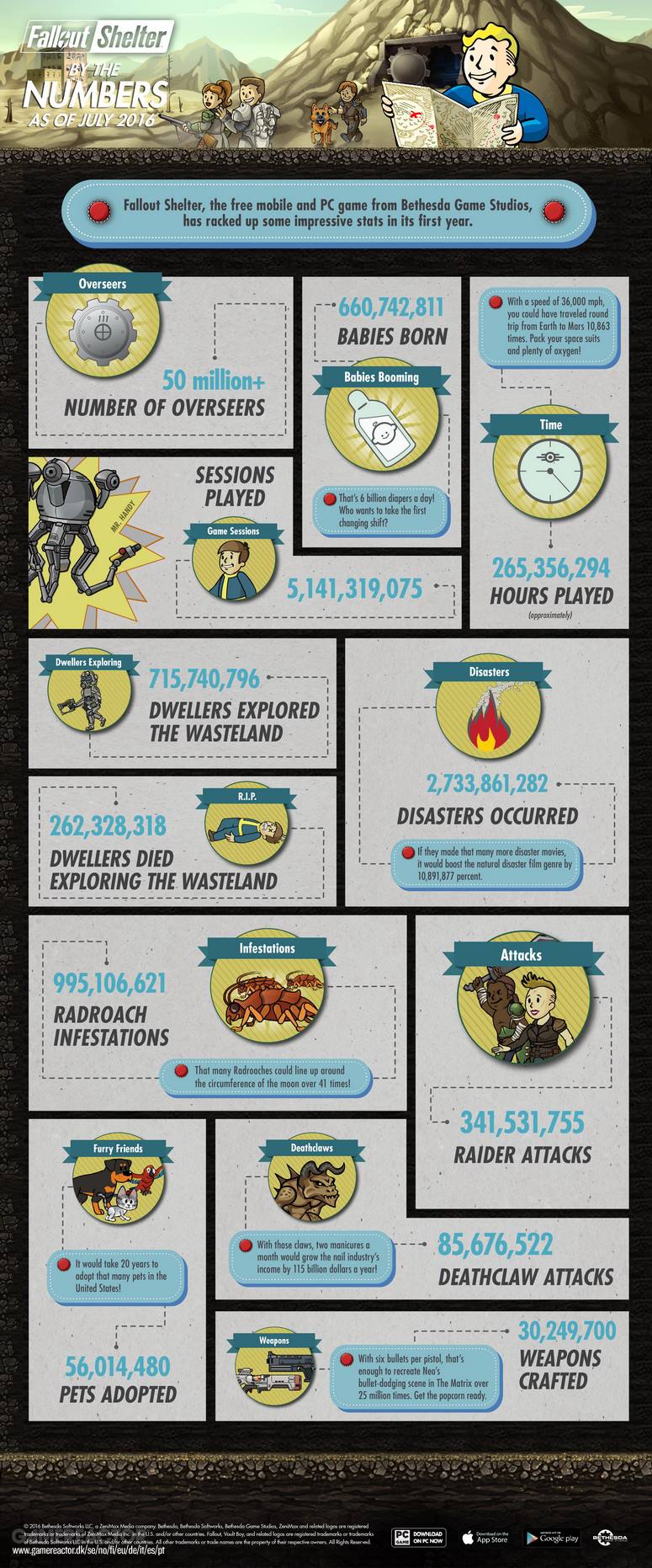 Un peu moins d'un an après la première, Bethesda présente un paquet de stats en tout genre dans cette infographie du premier anniversaire de Fallout Shelter: